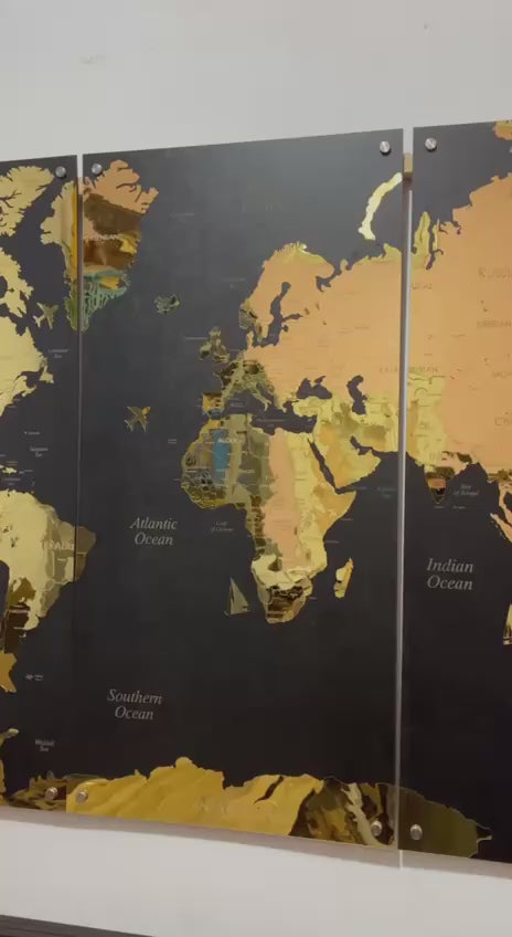 هذه اللوحة الفريدة تتكون من 3 قطع أنيقة، تحمل خريطة العالم بتصميم فاخر من الأكريليك الذهبي بلمعة المرآة، مما يمنحها مظهراً راقياً يعكس الأناقة والفخامة في أي مساحة.